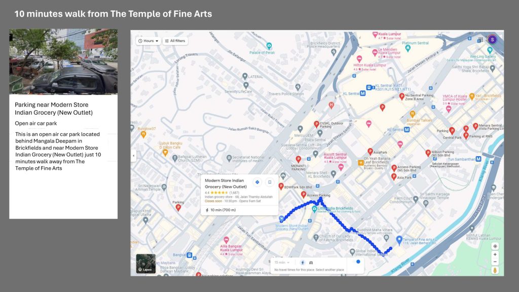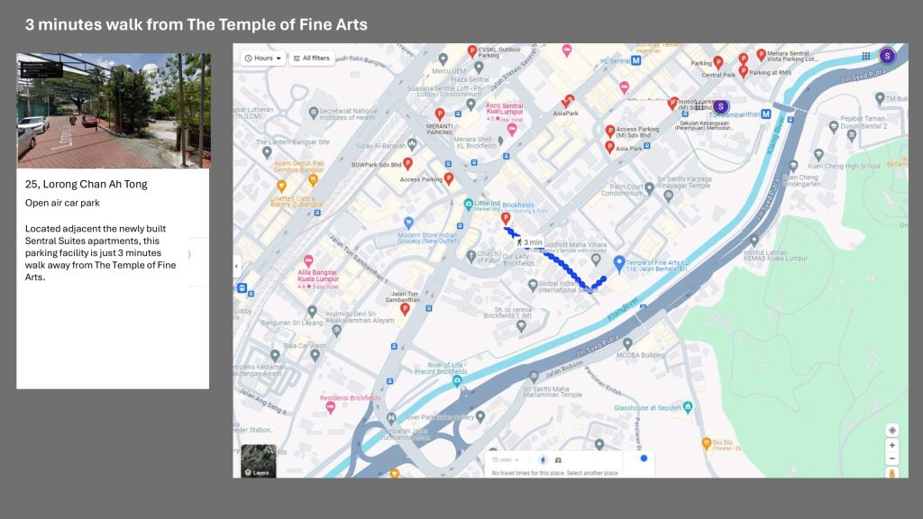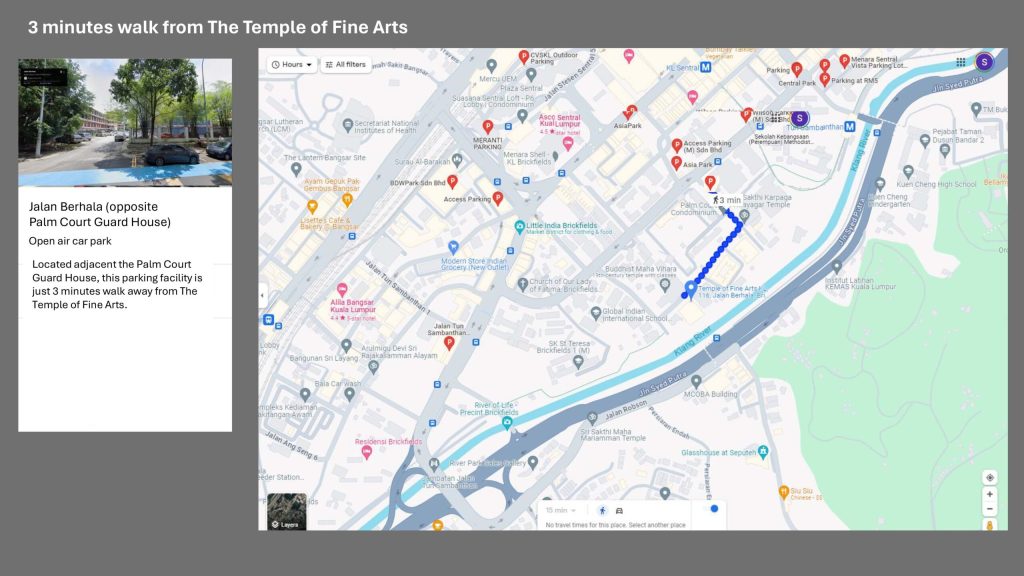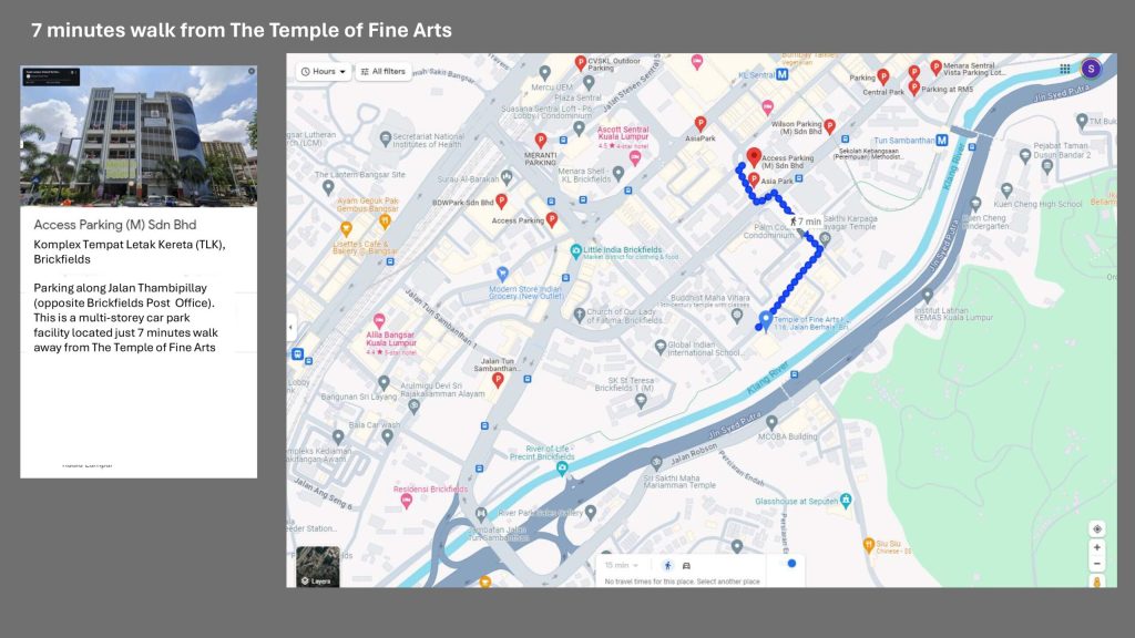 Parking in Brickfields can be a constant challenge; we highly recommend using e-hailing services for convenience. However, if you prefer to drive, here are some nearby parking options within close proximity to The Temple of Fine Arts building.